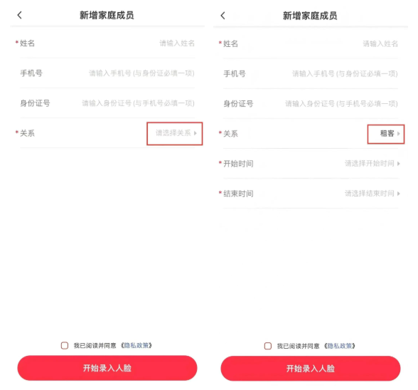 新增人脸录入的时候需要进行资料填写,姓名与关系(选择租客之后需要选择开始与结束时间)都是必填项,身份证号与手机号选填一项即可