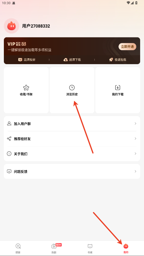 1、在我的内点击浏览历史。