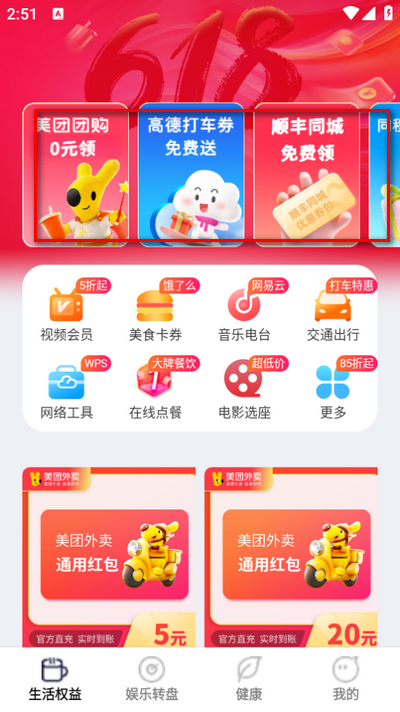 3、打开软件进入生活权益,会发现上面有很优惠卷可以领取