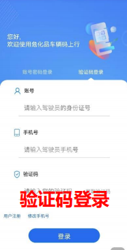 选择“验证码登录”,填写入园预约时的驾驶员的身份证号,点击获取验证码,填写验证码之后,点击登录。