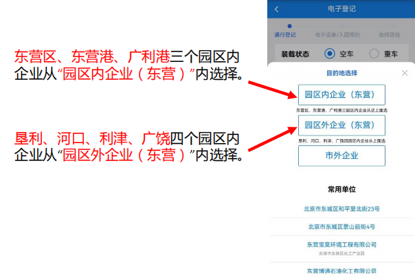 忽略后,根据自己装货所在位置选择“园区内企业(东营)”、“园区外企业(东营)”、“市外企业”,或常用单位中查找。
