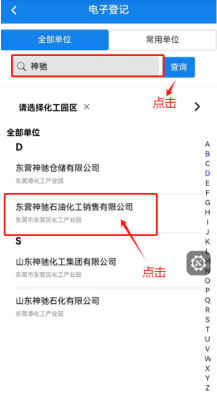选择“园区内企业(东营)”,点击搜索关键字,这里举例去神驰化工装货,那就搜索神驰关键字,选择神驰化工。(不确定企业全称的,只输入关键字即可)