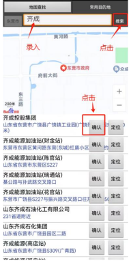 选择“园区外企业(东营)”,在地图上查找东营市内的企业,先输入企业名称关键字,点击搜索后会列出相关的位置信息,再点击确认后进行选择。