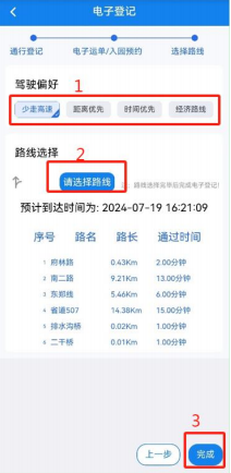 确认完入园预约后,点击下一步,进入路线选择界面。根据驾驶员的驾驶习惯选择驾驶偏好,自动生成路线,并显示路线详情列表,最后点击“完成”按钮。