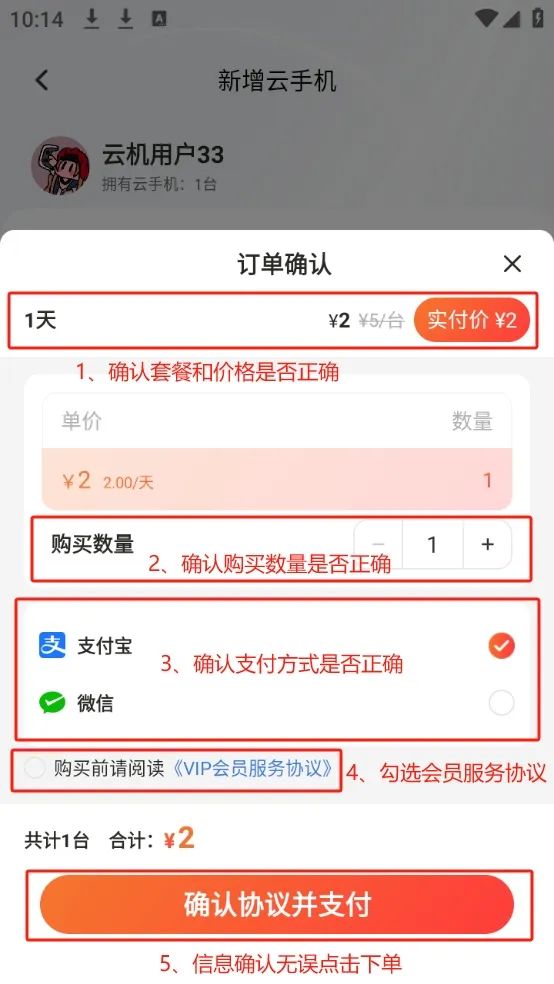 2.4 选择好需要购买的云手机数量以及支付方式,并勾选阅读协议后,点击“确认协议并支付”按钮,即可进入到支付界面。