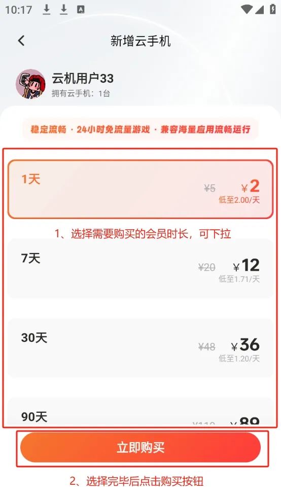 2.2 点击“新增云手机”或者“购买云手机”按钮进入到套餐选择界面。