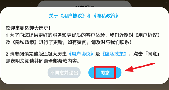 下载安装并打开适趣大历史app,在关于 《用户协议》 和 《隐私政策》提示界面点击同意