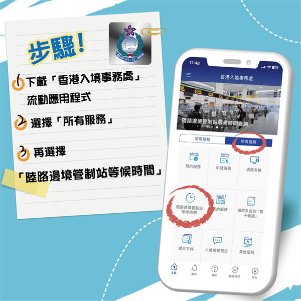 若不想花费额外时间排队过关,需下载入境处应用程序并善用“陆路边境管制站等候时间”功能,查看各陆路边境管制站的实时旅客排队过关情况,根据自己的行程和口岸最新状况选择最理想的管制站,以减少排队等候时间。