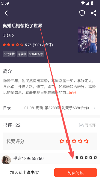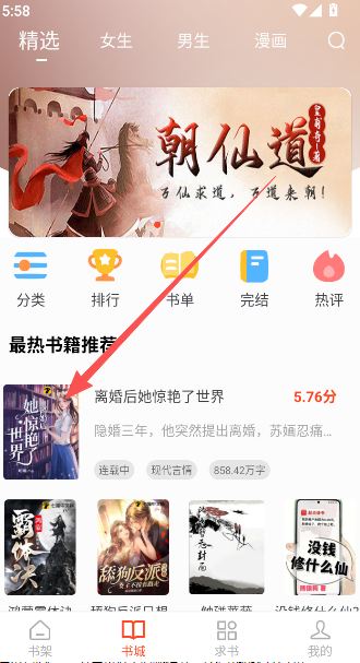 1、点击软件书城栏目,按照推荐分类或是默认榜单选择一本小说,点击查看详情部分。