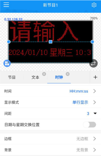 在节目编辑界面可设置文本的样式以及显示特效、时钟样式和简单的图片。注:一个显示屏节目最多添加两个节目区域。