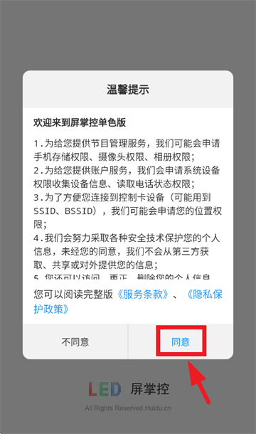 打开屏掌控单色版app,在温馨提示界面点击同意