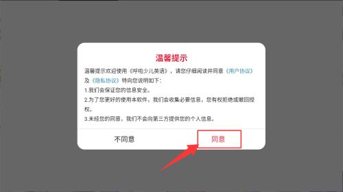 1、首次启动应用,请在温馨提示弹窗点击同意进入。