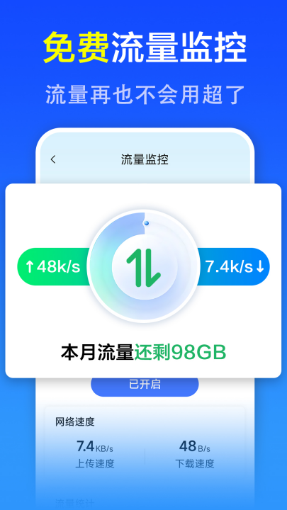 实时监控您的各个APP的网络流量使用情况,帮助您合理安排流量,避免超出套餐限制。