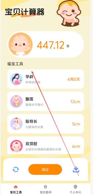 1、用户进入软件之后可以直接在工具页面中输入孕龄、腹围、股骨长等信息之后点击确认即可计算。