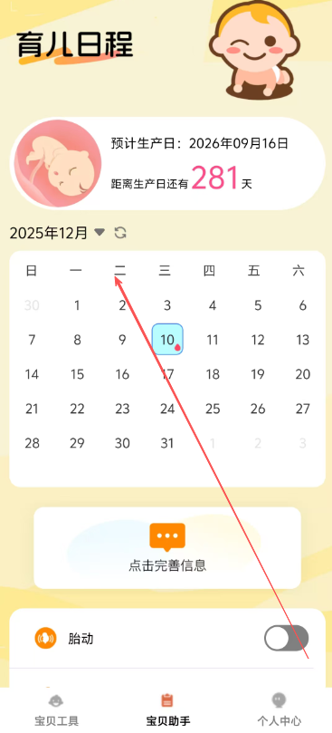 2、之后在育儿日程页面中用户还可以对自己的生成预期进行便捷的查看,还可以添加孕检信息。