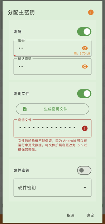 字符密码请保证强度,不要设置得过于简单,更不要忘记,不然整个数据库将无法打开(初次创建编辑过程中可设置得简单点以方便使用)。密钥文件可以选择图片、文档、音频等,还能使用应用内生成的bin文件。密钥文件可以复制,可以修改文件名。密钥文件不得丢失,请务必多设备多次备份!