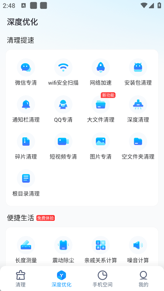 在“深度优化”页,可使用微信专清、大文件清理等细分功能,精准清理不同类型的冗余数据。