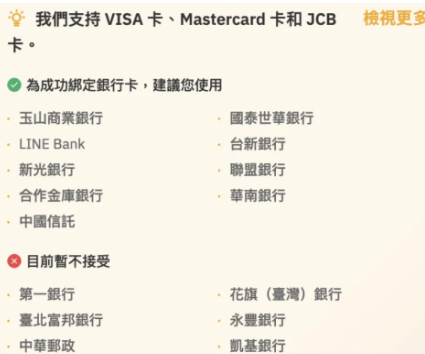 如果想用信用卡入金,有些银行的信用卡也没办法使用!目前支持的信用卡可参考下方~