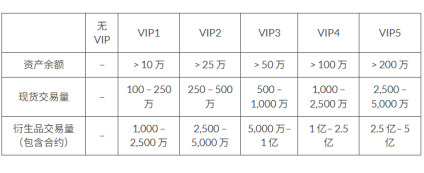 VIP 等级将根据用户的资产余额or最近30 天交易量而定。用户只需满足其中一项,即可解锁相应VIP 等级的手续费折扣。