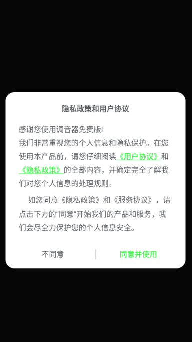 1、首先打开调音器免费版手机app阅读“隐私政策和用户协议”后,点击“同意并使用”按钮进入软件;