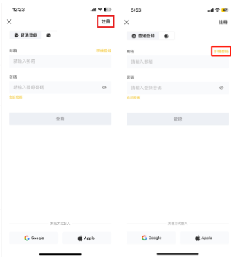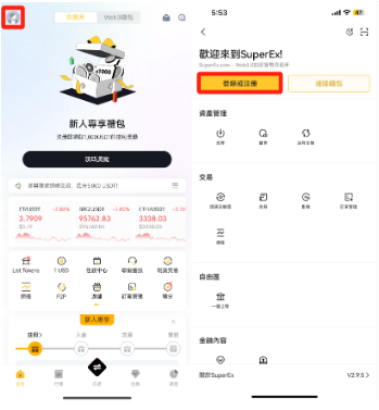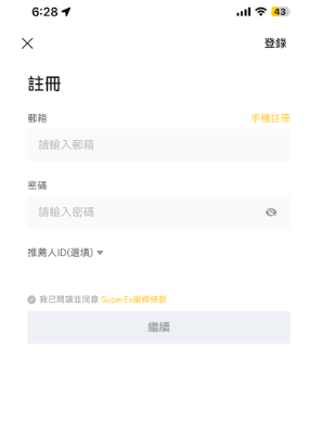 1. 下载完毕后,打开Superex APP,点左上角头像按钮,点击登录或注册按钮,点击右上角注册,进入注册页面;