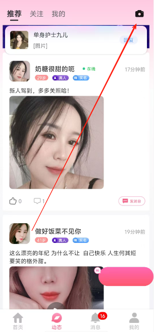 1、用户进入软件之后可以直接在动态页面中点击右上角的相机即可发布动态。