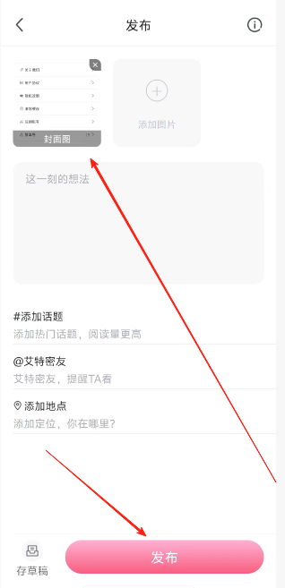 3、最后在发布页面中输入文案内容、话题、地点等内容之后点击发布即可。
