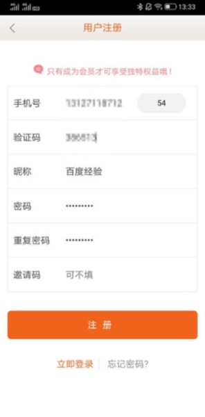 2、点击【立即注册】之后,我们可以直接进入注册的页面,是使用自己的手机号码进行注册。要填的相关信息就是【手机号】+【验证码】+【昵称】+【密码】。就可以完成注册了,没有太多的要求,注册起来也是比较简单的