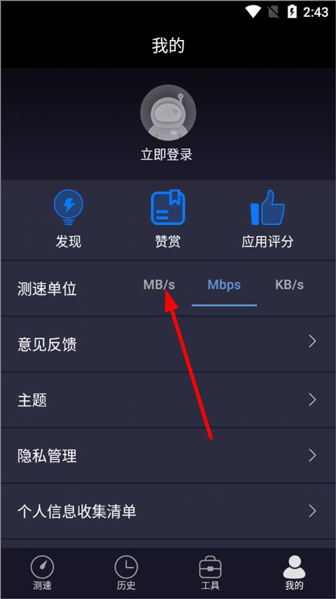 1、打开软件进入我的页面,有发现、赞赏、应用评分、意见反馈、主题等功能栏,点击选择测速单位;