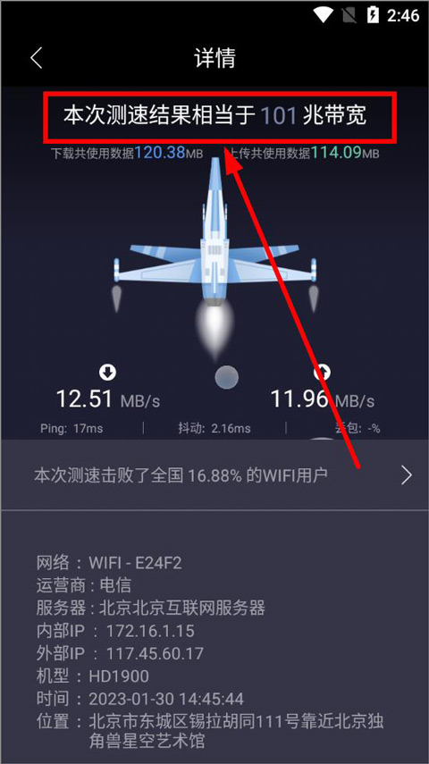 3、重新测速后,点击查看测速详情,详情页面可显示计算后的宽带结果。