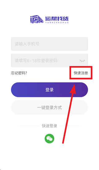 打开运帮找货app,进入登录界面后点击快速注册