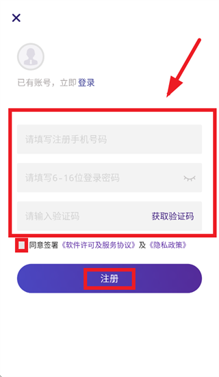 输入手机号,密码,验证码,勾选同意签署《软件许可及服务协议》及《隐私政策》,点击注册即可