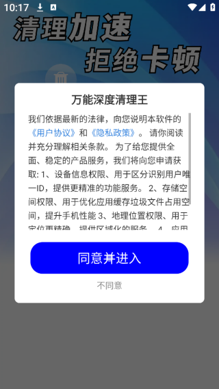 1、在本站下载万能深度清理王app后打开,进入的时候需要先同意隐私权限。