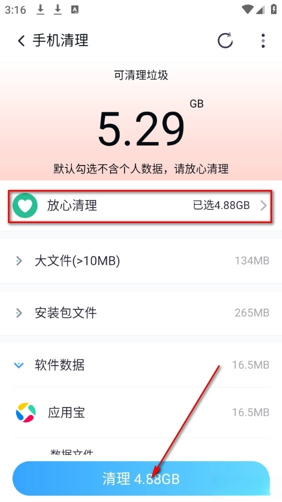 勾选需要清理的文件,系统默认已勾选不含个人数据的选项,之后点击下方的清理按钮即可。