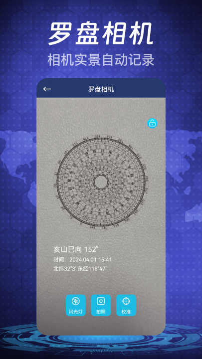 3、罗盘相机:提供经纬度定位和罗盘相结合的罗盘相机功能,既能查看方向,还可以进行经纬度、时间、地点位置的定位。