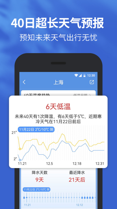 1、40日超长天气预报,预知未来天气出行无忧。