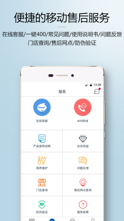 3、便捷的移动售后服务:在线客服、一键400、常见问题、使用说明书、问题反馈、门店查询、售后网点、防伪验证。