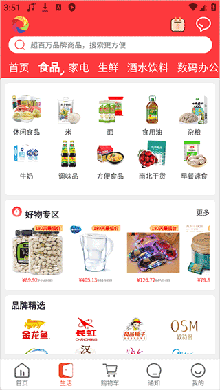 2、在生活界面可以线上购买食品、生鲜、酒水、家电、数码等商品