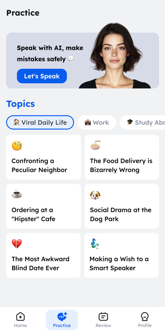 你可以随时与AI进行英语对话练习,覆盖日常交流、职场沟通、出国生活等常见场景。