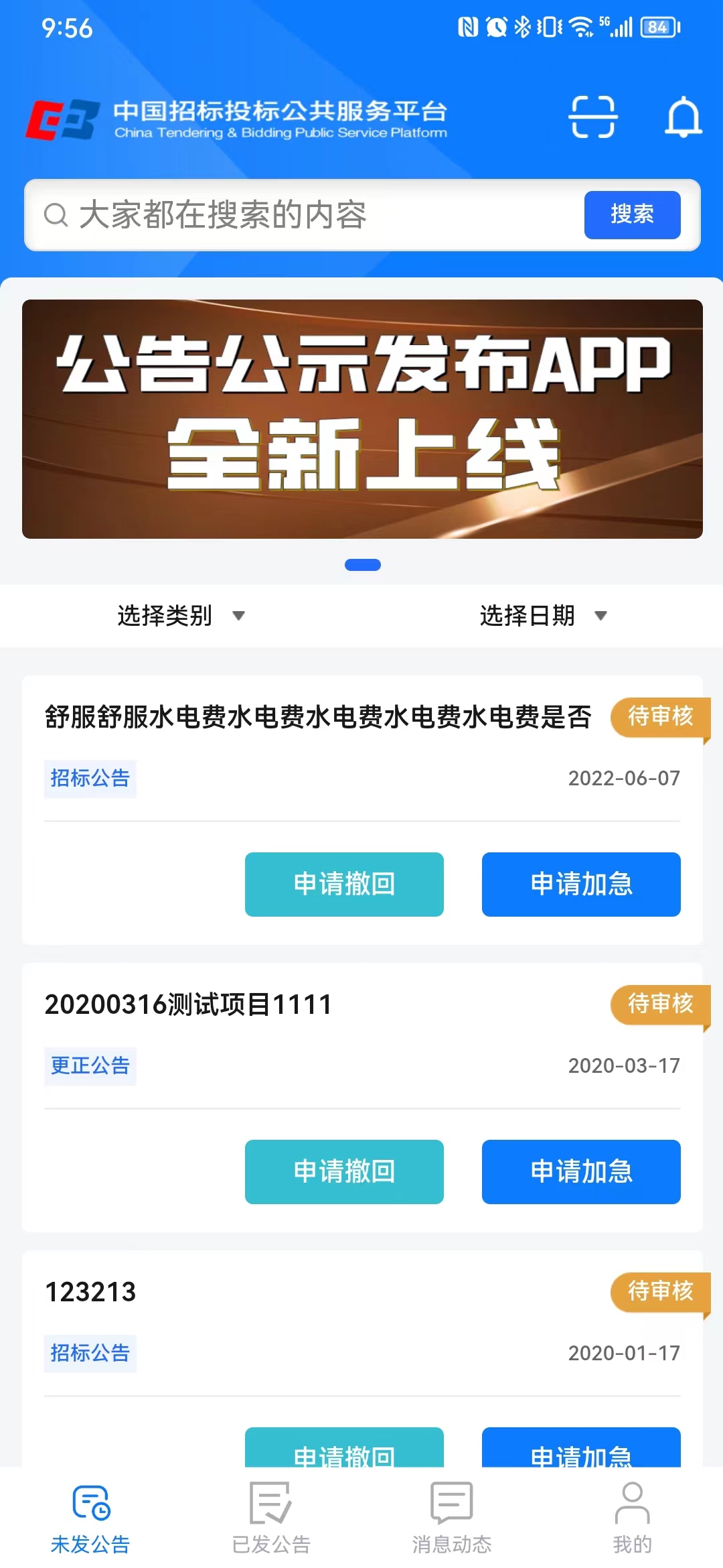 可通过实时消息查看待审核公告公示的审核状态以及核验不通过原因,可对未发布公告公示进行申请撤回和加急核验