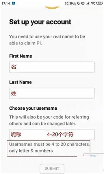 4、依次输入名、姓、昵称,点击SUBMIT。(名和姓可以输入中文,昵称4-20个字符。)