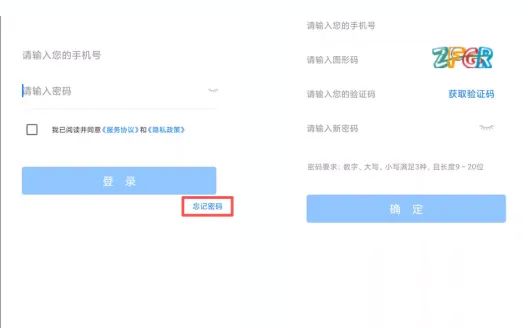 登录界面点击忘记密码,输入图形码,短信验证码,输入新密码,密码必须有字母大小写,带数字长度9-12位,不要特殊字符。