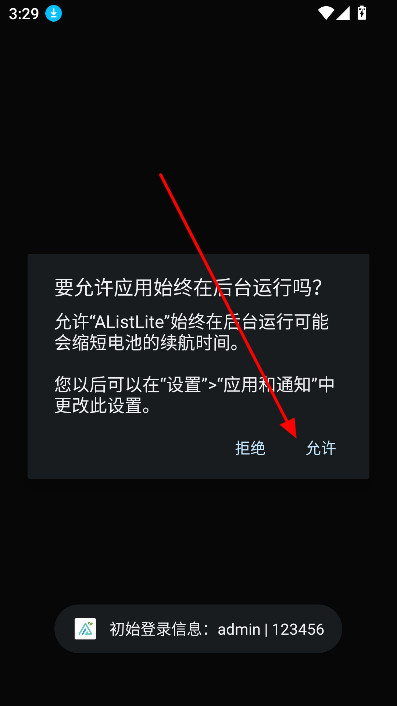 1、打开AListLite软件,点击允许