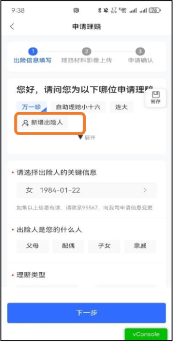 (2) 跳转至“出险信息填写”,选择对应需申请理赔的出险人。