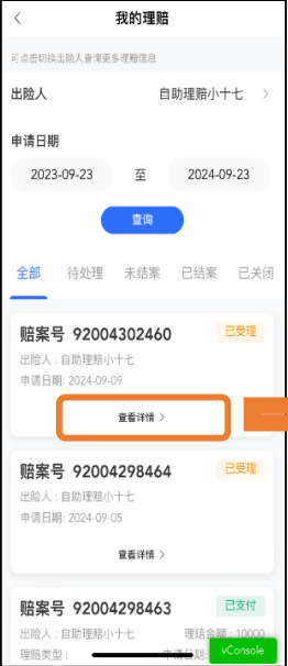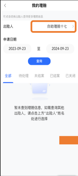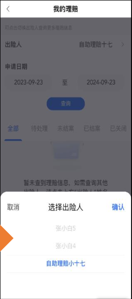 选择“出险人”,点击【查询】,可查询该出险人在“申请日期”范围内的所有个、团险线上线下申请的赔案情况。