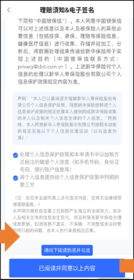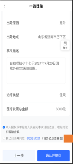 (1)核对信息至最底部,由客户进行本次理赔通知业务员的授权,阅读并勾选确认“理赔须知”。