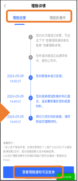 2理赔影像件:显示客户自助理赔上载的影像和自动生成的索赔申请书,结案后保留 3 个月。非自助理赔赔案不显示影像。