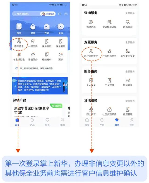 01项目选择:登录掌上新华app,首页点击“客户信息”或点击“服务”,在变更服务中选择“客户信息维护”