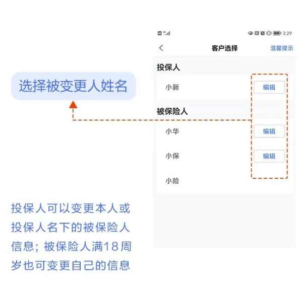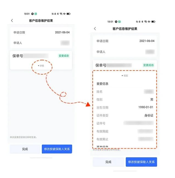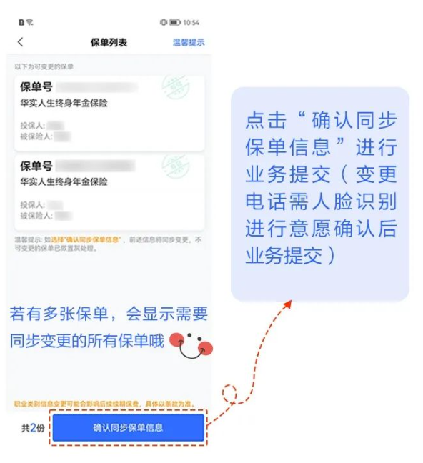 03信息确认:系统自动带出客户名下所有保单,均按前页面显示信息同步变更