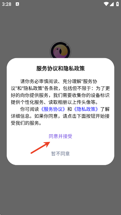 2、阅读服务协议和隐私政策后点击同意并接受;